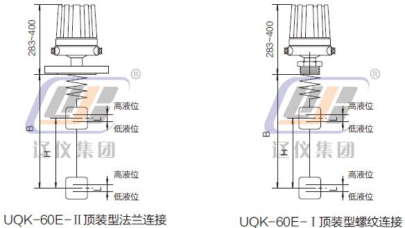 UQK-60E頂裝浮子(球)液位開關基于浮力原理是以浮子為感應元件,兩浮子同時懸掛一根鋼絲繩上,即彈簧被重于液體的浮子加載,浮子沉沒在液體里時浮力產生變化,致使彈簧向上位移。